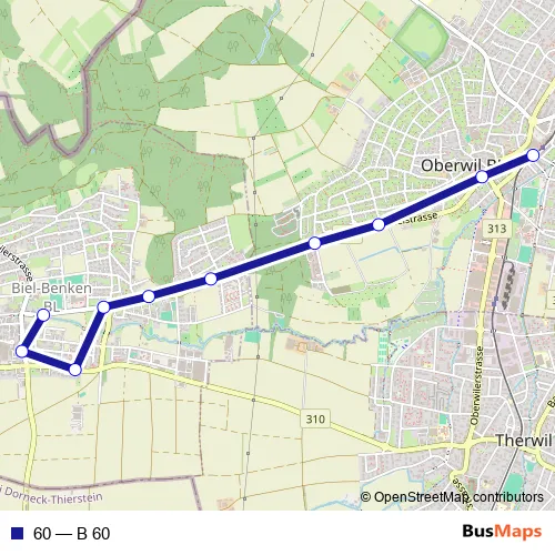 The first stop of the 60 bus route is Oberwil BL, Zentrum and the last stop is Biel-Benken BL, Brücke. 60 (B 60) is operational during on weekdays.