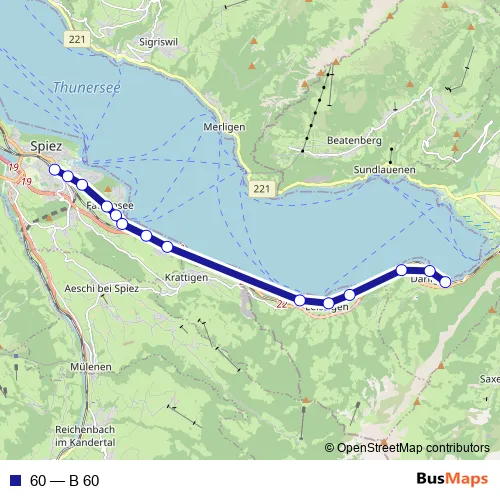 The first stop of the 60 bus route is Spiez, Bahnhof and the last stop is Därligen, Bahnhof. 60 (B 60) is operational during everyday.