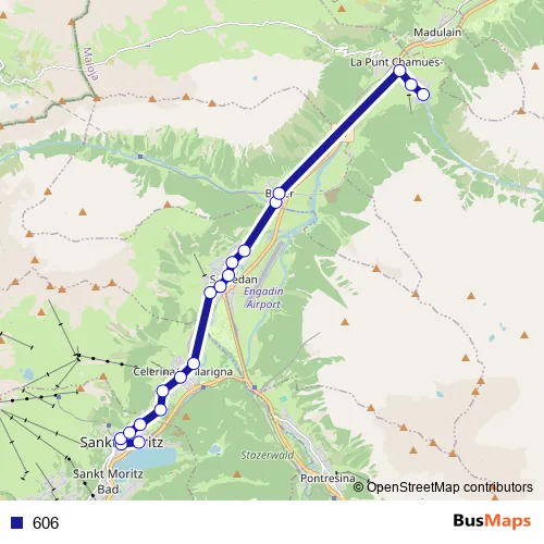 The first stop of the 606 bus route is St. Moritz, Bahnhof and the last stop is Chamues-ch, plaz. 606 is operational during everyday.