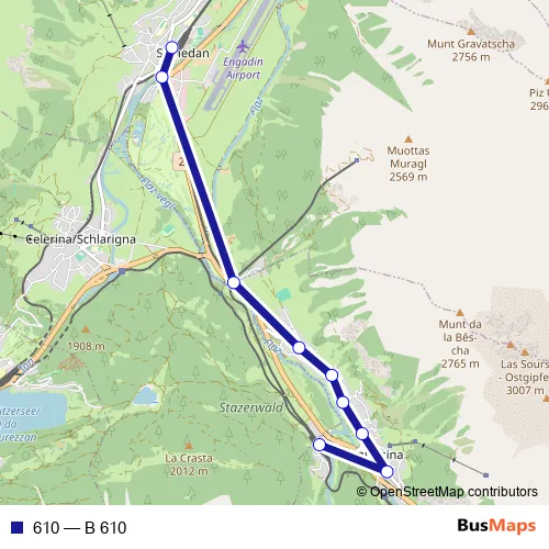 The first stop of the 610 bus route is Pontresina, Bahnhof and the last stop is Samedan, Bahnhof. 610 (B 610) is operational during everyday.