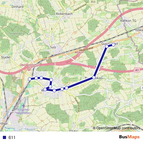 The first stop of the 611 bus route is Wiesendangen, Bahnhof and the last stop is Gundetswil. 611 is operational during on weekdays.
