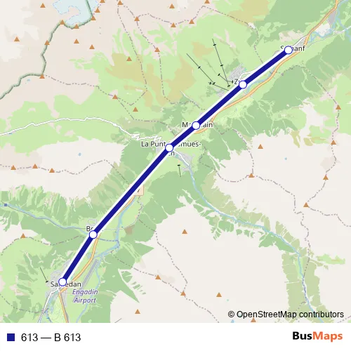 The first stop of the 613 bus route is Samedan, Bahnhof and the last stop is S-chanf, Chesa cumünela. 613 (B 613) is operational during everyday.
