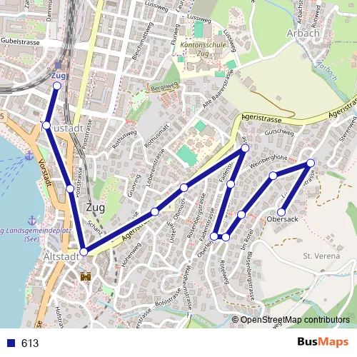 The first stop of the 613 bus route is Zug, Obersack and the last stop is Zug, Bahnhofplatz. 613 is operational during everyday.