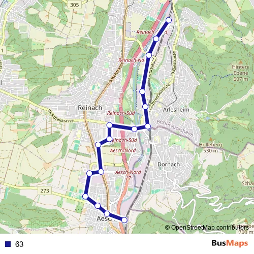 The first stop of the 63 bus route is Münchenstein, Bahnhof and the last stop is Aesch BL, Bahnhof. 63 is operational during on weekdays.