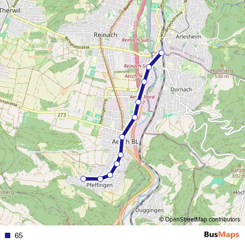 The first stop of the 65 bus route is Dornach, Bahnhof and the last stop is Pfeffingen, Bergmattenweg. 65 is operational during everyday.