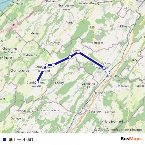 The first stop of the 661 bus route is Combremont-le-Petit, poste and the last stop is Granges-près-Marnand, gare. 661 (B 661) is operational during on weekdays.