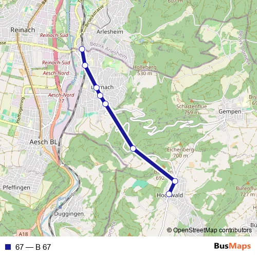 The first stop of the 67 bus route is Hochwald, Dorfzentrum and the last stop is Dornach, Bahnhof. 67 (B 67) is operational during on weekends.