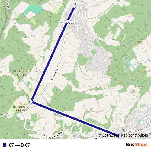 The first stop of the 67 bus route is Hochwald, Rest. Rössli and the last stop is Seewen SO, Herrenmatt. 67 (B 67) is operational during everyday.