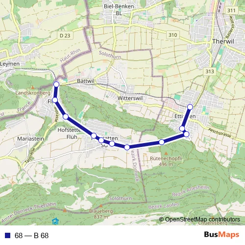 The first stop of the 68 bus route is Ettingen, Dorf and the last stop is Flüh, Station. 68 (B 68) is operational during on weekends.