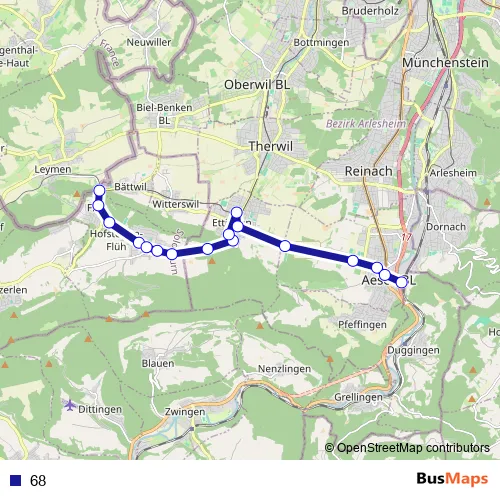 The first stop of the 68 bus route is Flüh, Station and the last stop is Aesch BL, Bahnhof. 68 is operational during everyday.