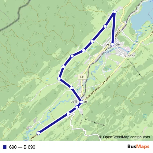 The first stop of the 690 bus route is Le Brassus, Bas-du-Chenit and the last stop is Le Sentier-L'Orient, gare. 690 (B 690) is operational during on weekdays.