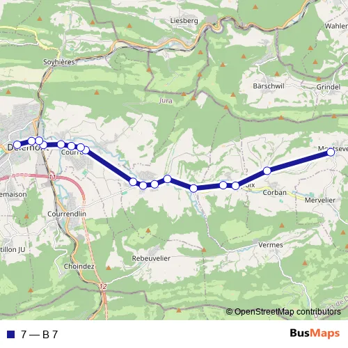 The first stop of the 7 bus route is Montsevelier, poste and the last stop is Delémont, gare. 7 (B 7) is operational during everyday.