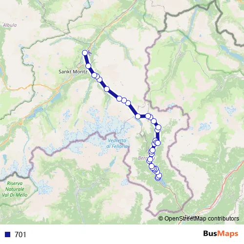 The first stop of the 701 bus route is Le Prese, Stazione and the last stop is Samedan, Bahnhof. 701 is operational during everyday.