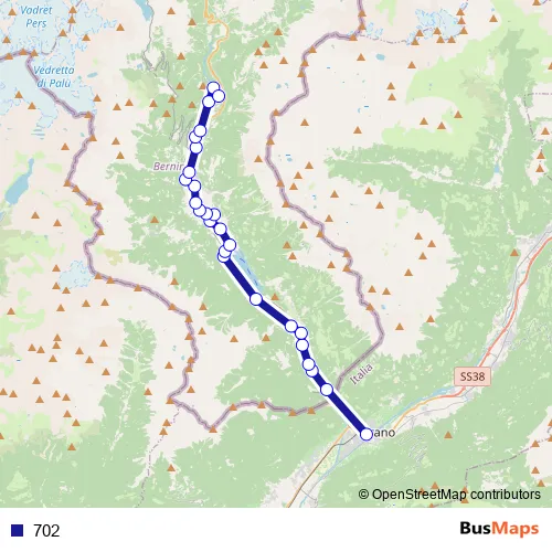 The first stop of the 702 bus route is Tirano, Stazione and the last stop is S. Carlo GR, Percosta. 702 is operational during everyday.