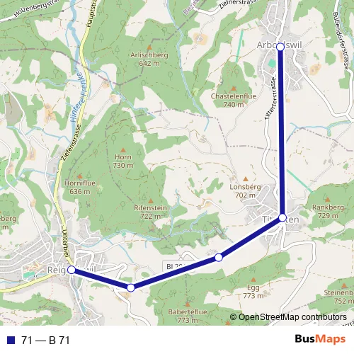 The first stop of the 71 bus route is Arboldswil, Dorf and the last stop is Reigoldswil, Dorfplatz. 71 (B 71) is operational during on weekdays.