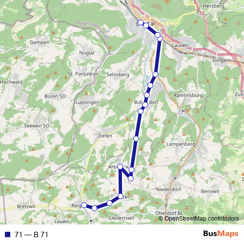 The first stop of the 71 bus route is Reigoldswil, Dorfplatz and the last stop is Liestal, Bahnhof. 71 (B 71) is operational during everyday.