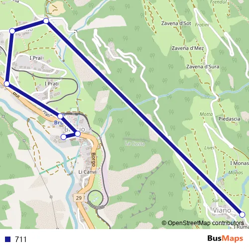 The first stop of the 711 bus route is Brusio, Scuole and the last stop is Viano, Paese. 711 is operational during on weekdays.
