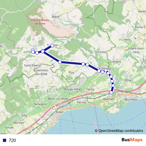 The first stop of the 720 bus route is Gimel, La Vernette and the last stop is Allaman, gare. 720 is operational during everyday.