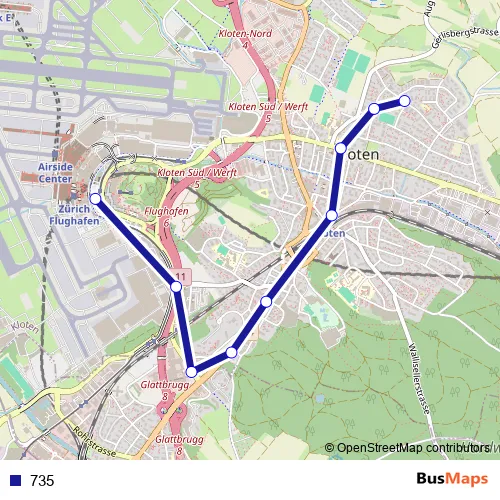 The first stop of the 735 bus route is Zürich Flughafen, Bahnhof and the last stop is Kloten, Härdlen. 735 is operational during everyday.