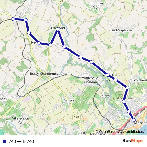 The first stop of the 740 bus route is Morges, gare and the last stop is Apples, gare. 740 (B 740) is operational during everyday.