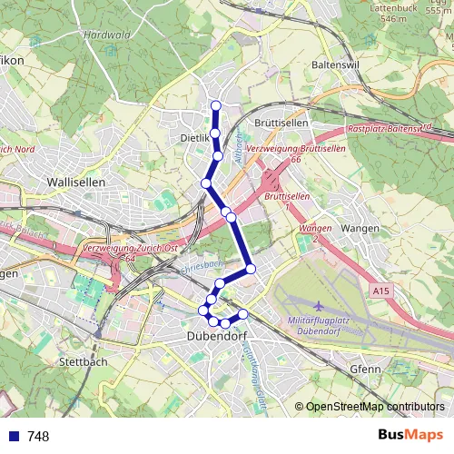 The first stop of the 748 bus route is Dietlikon, Hofwiesen and the last stop is Dübendorf, Bahnhof. 748 is operational during everyday.