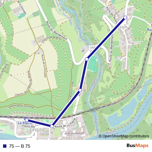 The first stop of the 75 bus route is La Plaine, gare and the last stop is Russin, village. 75 (B 75) is operational during on weekdays.