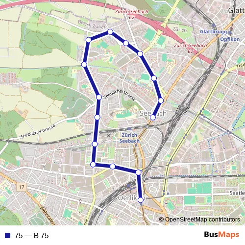 The first stop of the 75 bus route is Zürich, Seebacherplatz and the last stop is Zürich, Sternen Oerlikon. 75 (B 75) is operational during everyday.
