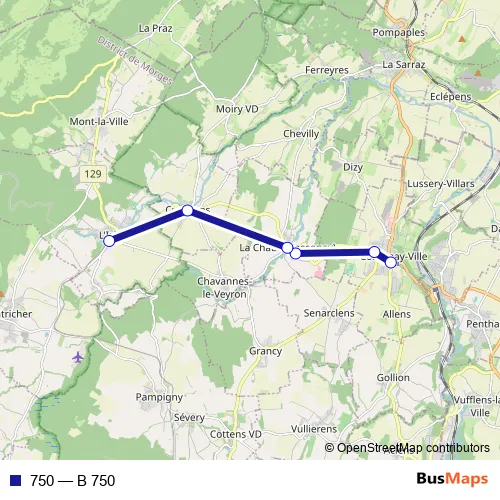 The first stop of the 750 bus route is Cossonay-Ville, centre and the last stop is L'Isle, gare. 750 (B 750) is operational during everyday.