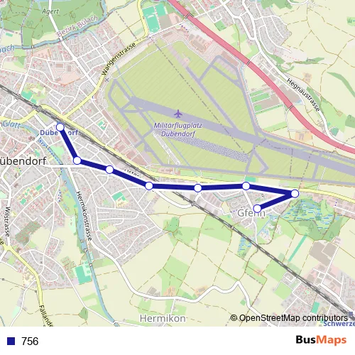 The first stop of the 756 bus route is Dübendorf, Bahnhof and the last stop is Dübendorf, Gfenn. 756 is operational during everyday.