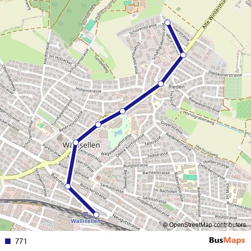 The first stop of the 771 bus route is Wallisellen, Bahnhof and the last stop is Wallisellen, Schäfligraben. 771 is operational during everyday.