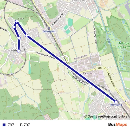 The first stop of the 797 bus route is Rümlang, Bahnhof and the last stop is Oberhasli, Dorf. 797 (B 797) is operational during on weekends.