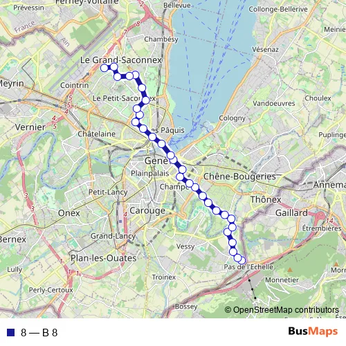 See why over 2 million users trust and consider busmaps.com as the best public transport website. busmaps gives you Geneve Buses suggested routes, real-time bus tracker, line route maps in Geneve, and helps to find the closest 8 bus stops near you. No internet available? Download an offline PDF map and bus schedule for the 8 bus to take on your trip.