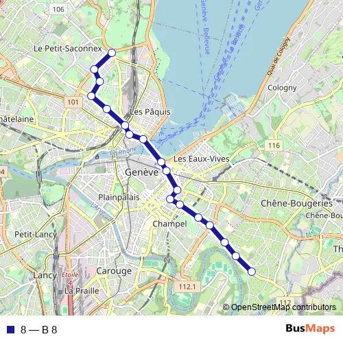 See why over 2 million users trust and consider busmaps.com as the best public transport website. busmaps gives you Geneve Buses suggested routes, real-time bus tracker, line route maps in Geneve, and helps to find the closest 8 bus stops near you. No internet available? Download an offline PDF map and bus schedule for the 8 bus to take on your trip.