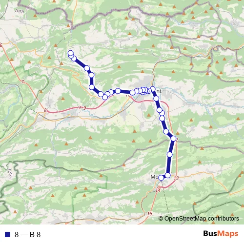 See why over 2 million users trust and consider busmaps.com as the best public transport website. busmaps gives you Delemont Buses suggested routes, real-time bus tracker, line route maps in Delemont, and helps to find the closest 8 bus stops near you. No internet available? Download an offline PDF map and bus schedule for the 8 bus to take on your trip.