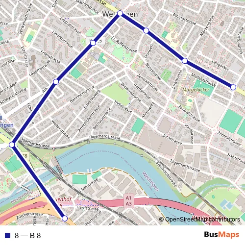 The first stop of the 8 bus route is Wettingen, Busgarage and the last stop is Neuenhof, Kreuzstein. 8 (B 8) is operational during on weekdays.