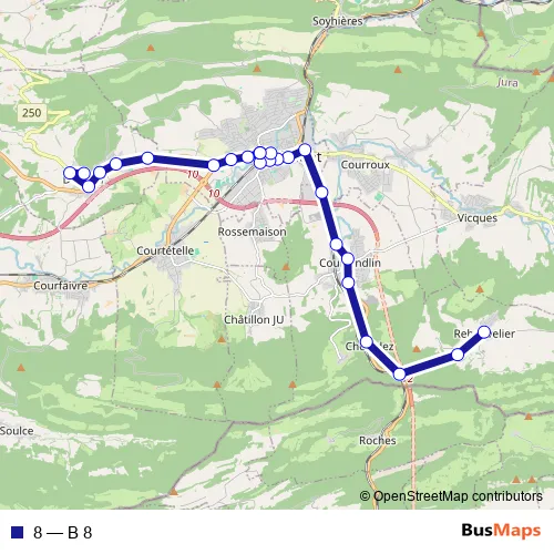 The first stop of the 8 bus route is Rebeuvelier, poste and the last stop is Develier, Sur Cré. 8 (B 8) is operational during everyday.