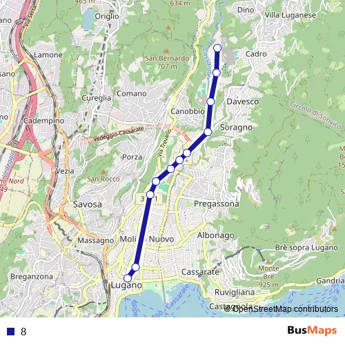 See why over 2 million users trust and consider busmaps.com as the best public transport website. busmaps gives you Lugano Buses suggested routes, real-time bus tracker, line route maps in Lugano, and helps to find the closest 8 bus stops near you. No internet available? Download an offline PDF map and bus schedule for the 8 bus to take on your trip.
