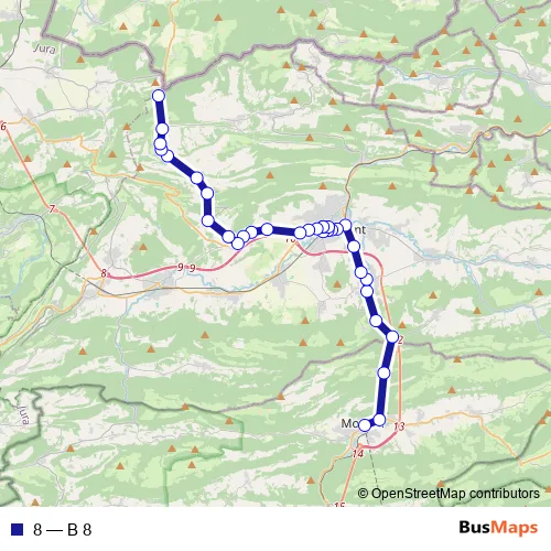 The first stop of the 8 bus route is Moutier, Suisse Est and the last stop is Lucelle. 8 (B 8) is operational during on weekends.
