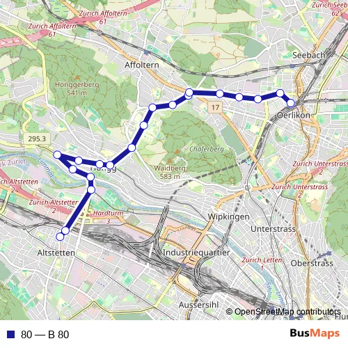 The first stop of the 80 bus route is Zürich Altstetten, Bahnhof and the last stop is Zürich Oerlikon, Bahnhof Nord. 80 (B 80) is operational during everyday.