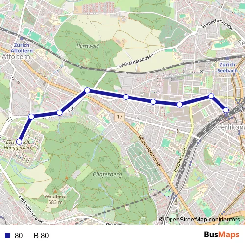 The first stop of the 80 bus route is Zürich Oerlikon, Bahnhof Nord and the last stop is Zürich, ETH Hönggerberg. 80 (B 80) is operational during everyday.