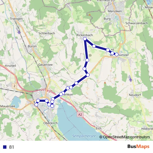 The first stop of the 81 bus route is Beromünster, Post and the last stop is Sursee, Bahnhof. 81 is operational during everyday.