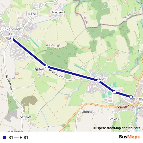 The first stop of the 81 bus route is Rickenbach LU, Dorf and the last stop is Beromünster, Post. 81 (B 81) is operational during everyday.