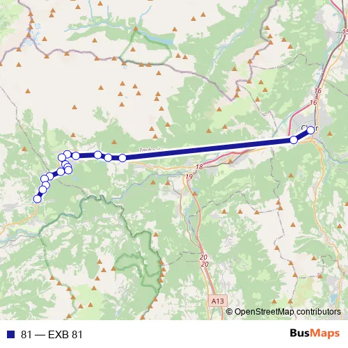 The first stop of the 81 bus route is Chur, Postautostation and the last stop is Laax GR, posta. 81 (EXB 81) is operational during everyday.