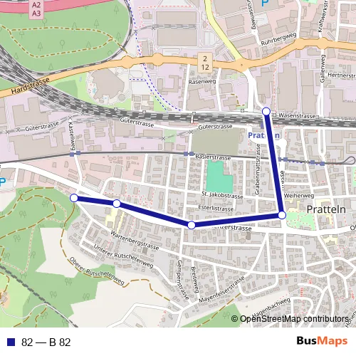 The first stop of the 82 bus route is Pratteln, Bahnhof Nord and the last stop is Pratteln, Chästeli. 82 (B 82) is operational during everyday.