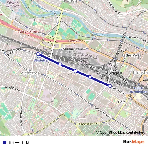The first stop of the 83 bus route is Zürich, Herdernstrasse and the last stop is Zürich Altstetten, Bahnhof. 83 (B 83) is operational during everyday.