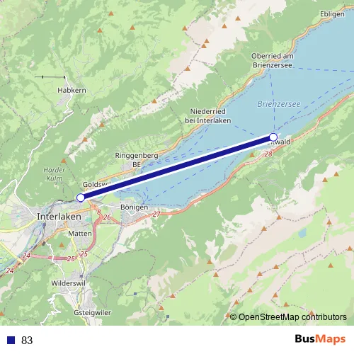 The first stop of the 83 ferry route is Interlaken Ost (See) and the last stop is Iseltwald (See). 83 is operational during everyday.