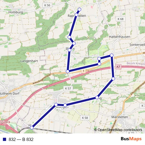The first stop of the 832 bus route is Müllheim-Wigoltingen, Bahnhof and the last stop is Raperswilen, Schulhaus. 832 (B 832) is operational during on weekdays.