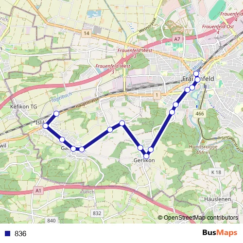 The first stop of the 836 bus route is Frauenfeld, Bahnhof and the last stop is Islikon, Bahnhof. 836 is operational during everyday.