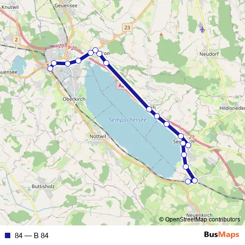 The first stop of the 84 bus route is Sempach Station and the last stop is Sursee, Bahnhof. 84 (B 84) is operational during everyday.
