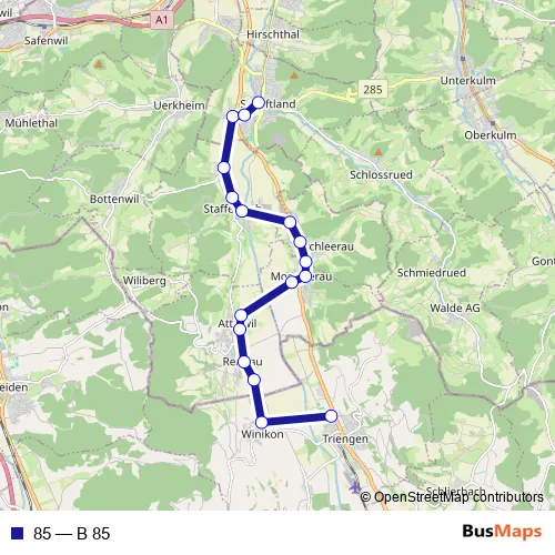 The first stop of the 85 bus route is Triengen, Gisler and the last stop is Schöftland, Bahnhof. 85 (B 85) is operational during on weekdays.